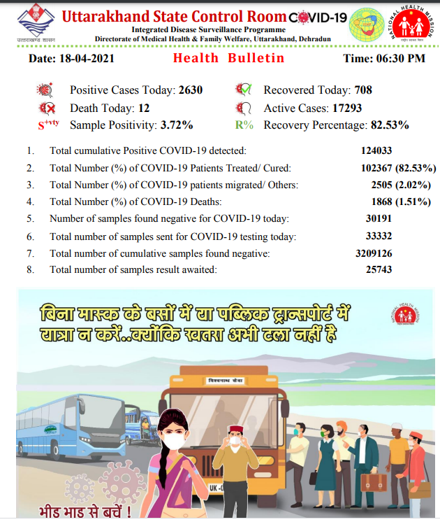 देहरादून। उत्तराखंड में कोरोना संक्रमण थमने का नाम नहीं ले रहा है। रविवार को 24 घंटे के अंदर 2630 नए कोरोना संक्रमित मरीज सामने आए। वहीं, 12 मरीजों की मौत हुई, जबकि 708 मरीजों को ठीक होने के बाद डिस्चार्ज किया गया। सक्रिय मरीजों की संख्या भी 17293 हो गई है। प्रदेश में अब तक कुल 1 लाख 24 हजार 33 संक्रमित मरीज आ चुके हैं, जिसमें से 102367 मरीज स्वस्थ हो चुके हैं।