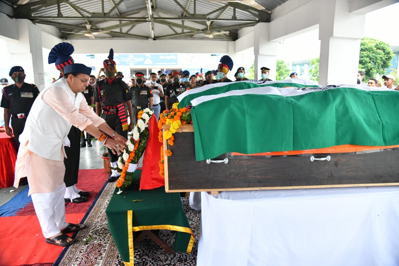 मुख्यमंत्री श्री पुष्कर सिंह धामी ने जौलीग्रांट एयरपोर्ट पर कश्मीर में आतंकियों से लोहा लेते हुए शहीद हुए सूबेदार अजय सिंह और नायक हरेंद्र सिंह के पार्थिव देह पर पुष्प चक्र अर्पित कर श्रद्धांजलि दी। मुख्यमंत्री ने उनकी शहादत को नमन करते हुए कहा कि राज्य सरकार शहीदों के परिजनों के साथ हर समय खङी है।