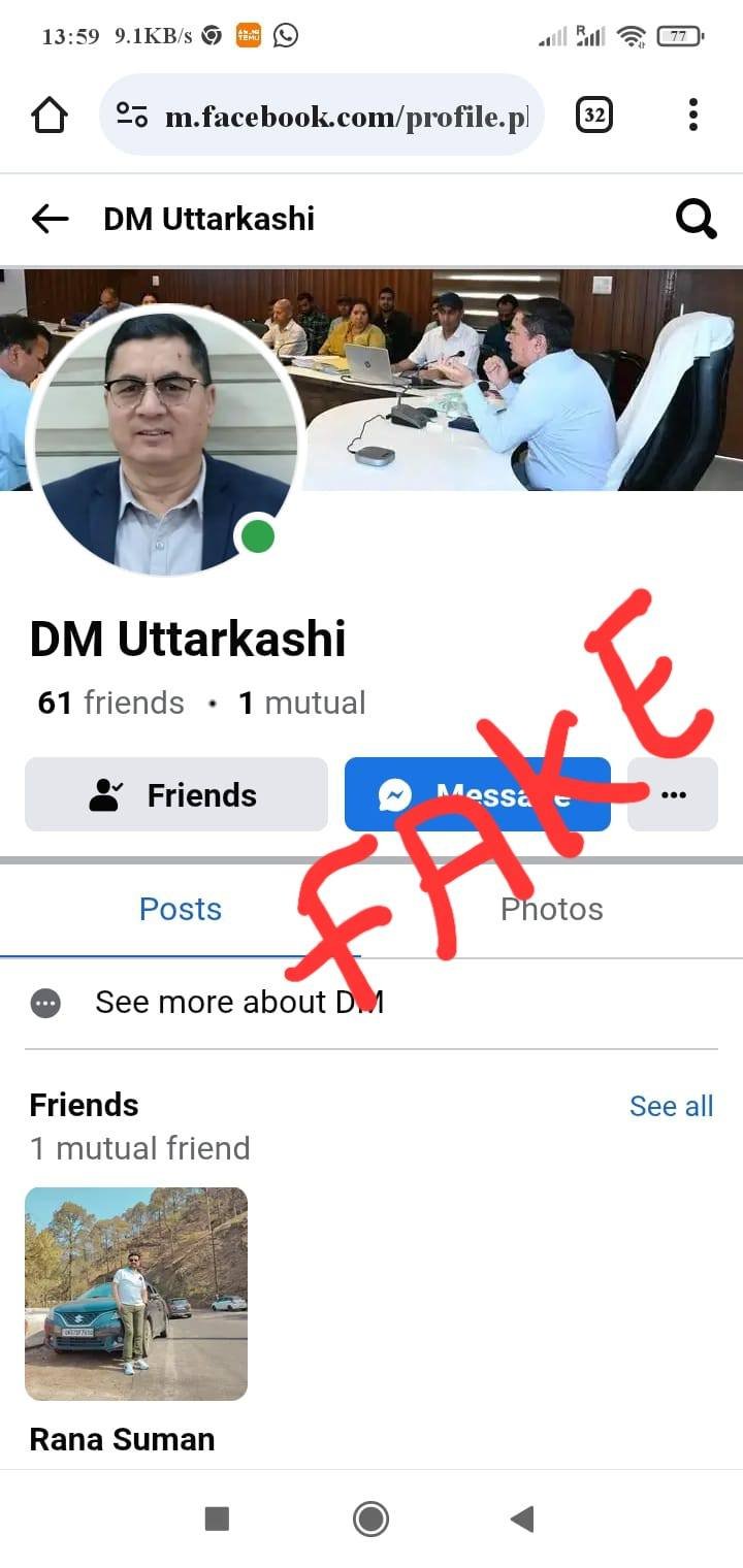 उत्तरकाशी से एक चौंकाने वाला मामला सामने आया है, जहाँ जिला मजिस्ट्रेट डॉ. मेहरबान सिंह बिष्ट के नाम से फर्जी सोशल मीडिया अकाउंट बनाकर कुछ साइबर ठग जनता को ठगने की कोशिश कर रहे हैं। इन फर्जी प्रोफाइल्स के जरिए लोगों को झांसा दिया जा रहा है, प्रलोभन में लेकर उनके साथ वित्तीय धोखाधड़ी की जा रही है।