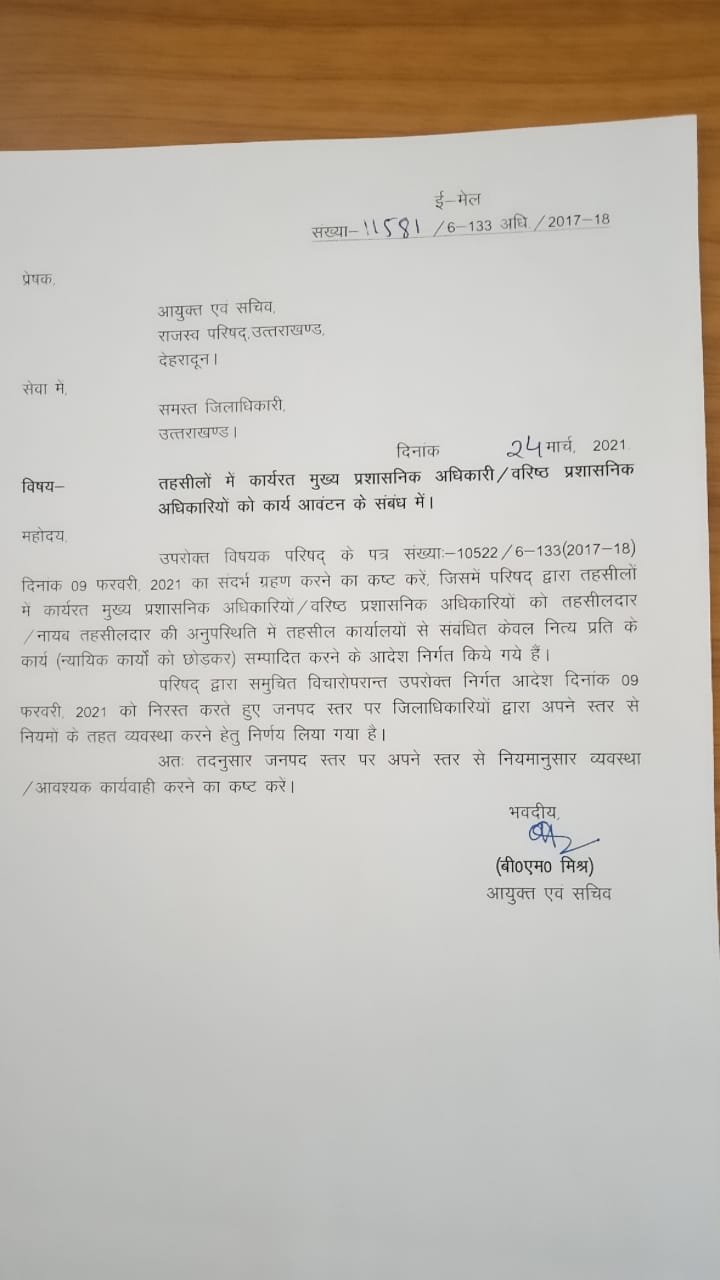 तहसीलों में कार्यरत मुख्य प्रशासनिक अधिकारी वरिष्ठ प्रशासनिक अधिकारियों को तहसीलदार नायब तहसीलदार कार्य आवंटन के संबंध में जारी शासनादेश को आयुक्त एवं सचिव राजस्व परिषद उत्तराखंड सरकार ने वापस ले लिया है। गौरतलब है की मेरु रेबार ने इस समाचार को प्रमुखता से प्रकाशित, प्रसारित किया था जिसके बाद सोशल मीडिया पर आम लोगों की प्रतिक्रियाओं की बाढ़ आ गई थी, जिसको संज्ञान लेकर आयुक्त एवं सचिव राजस्व परिषद उत्तराखंड देहरादून ने अपने पत्रांक, 10522/6-133(2017-18) दिनांक 24 मार्च 2021 को प्रदेश के सभी जिला अधिकारियों को लिखे गए पत्र में कहां है की तहसीलों में कार्यरत मुख्य प्रशासनिक अधिकारी वरिष्ठ प्रशासनिक अधिकारियों को तहसीलदार नायब तहसीलदार की अनुपस्थिति में तहसील कार्यालयों से संबंधित केवल नित्य प्रति के कार्य न्यायिक कार्यों को छोड़कर संपादित करने के जो आदेश निर्गत किए गए हैं ,परिषद द्वारा समुचित विचारों प्रांत उपरोक्त निर्गत आदेश दिनांक 9 फरवरी 2021 को निरस्त करते हुए जनपद के जिला अधिकारियों द्वारा अपने स्तर व्यवस्था करने का निर्णय लिया गया है।
