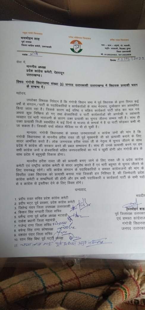 विधान सभा चुनाव के लिहाज से उत्तराखंड की ज़्यादातर विधानसभाओ मे टिकट की मारामारी के बीच अब तक शांत रही गंगोत्री विधान सभा मे कॉंग्रेस पार्टी के पूर्व जिला अध्यक्ष मनमोहन शाह ने हलचल पैदा कर दी है | कॉंग्रेस प्रदेश आलाकमान को सौंपे अपने ज्ञापन मे उन्होने गंगोत्री से पूर्व विधायक और इस बार टिकट के प्रबल और अकेले दावेदार पर की सवाल उठाए है |