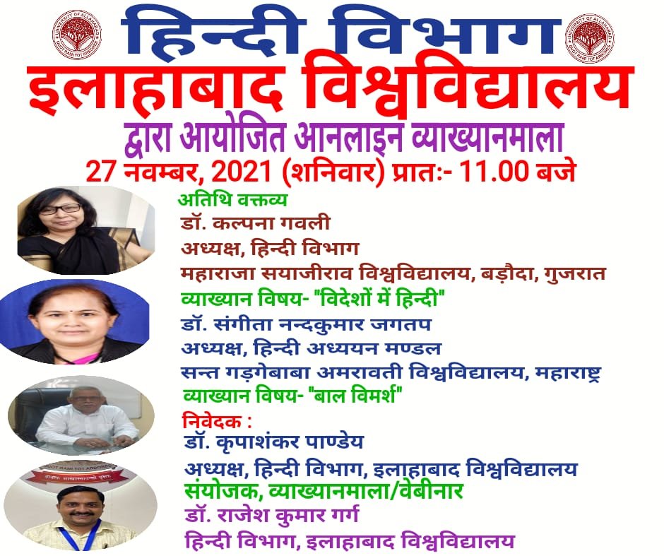हिन्दी विभाग, इलाहाबाद विश्वविद्यालय द्वारा आयोजित व्याख्यानमाला के प्रथम सत्र में बोलते हुए महाराजा सयाजीराव विश्वविद्यालय, गुजरात की हिन्दी विभागाध्यक्षा, प्रोफेसर कल्पना गवली ने कहा कि आज हिन्दी विश्व की 10 चर्चित भाषाओं में से एक है। 137 देशों में हिन्दी को किसी न किसी रूप में समझा जाता है। यह ज्ञान, विज्ञान, तकनीकी, भावना, आदर्श, पीड़ा वेदना आदि सबकी समर्थ भाषा है। प्रश्न है कि विश्व भाषा के लिए इसे कैसे परिमार्जित किया जाए? उन्होंने 1965 में रोमानिया में प्रारम्भ हुए हिन्दी के पठन-पाठन का सन्दर्भ देते हुए कहा कि उसके बाद से दुनिया के कई देशों में किसी न किसी प्रकार के हिन्दी शिक्षण का प्रारम्भ हुआ।