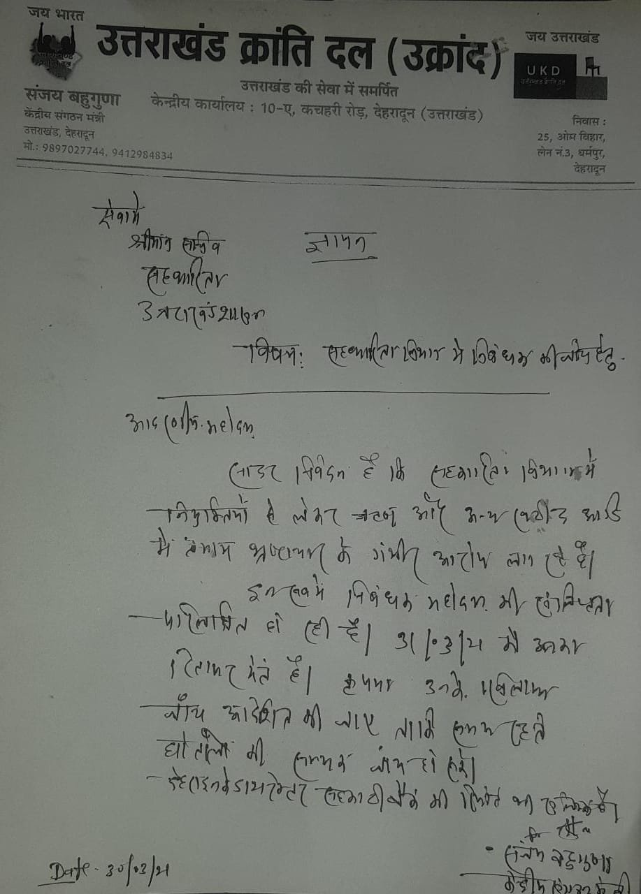 उत्तराखंड क्रांति दल ने आज सहकारिता सचिव को ज्ञापन सौंपते हुए सहकारिता निबंधक के खिलाफ जांच बिठाने की मांग की है।