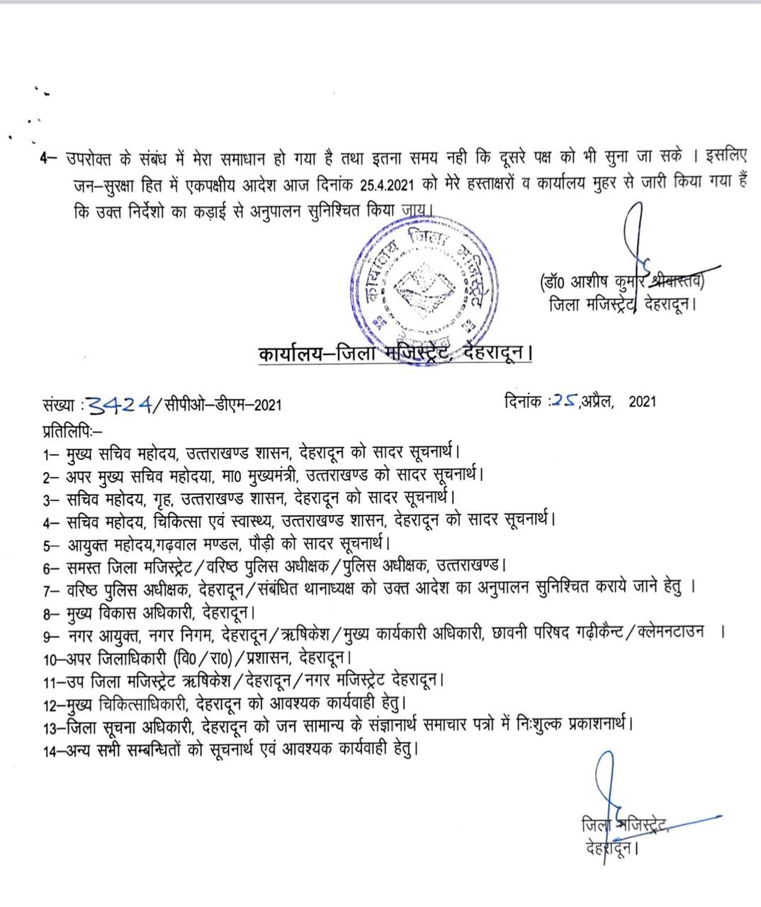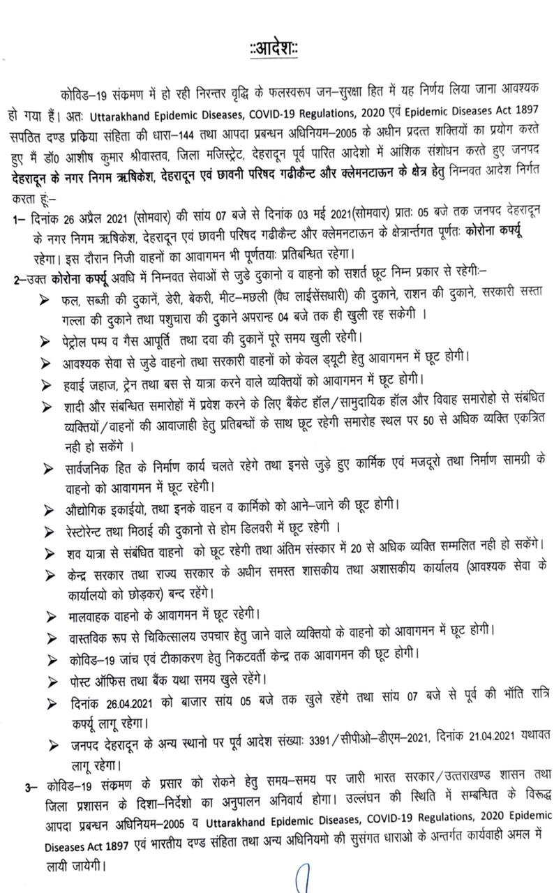 लगा दिया है यानी 26 अप्रैल से 3 मई तक देहरादून में पूर्ण लॉकडाउन रहेगा इसके तहत फल सब्जी की दुकान में डेयरी बेकरी की दुकान है राशन की दुकान है सस्ते गल्ले की दुकान है तथा पशु चारे की दुकानें अपराहन 4:00 बजे तक ही खुल सकेंगे पेट्रोल पंप गैस आपूर्ति और दवा की दुकान है पूरे समय खुली रहेंगी आवश्यक सेवा से जुड़े वाहनों व सरकारी वाहनों को केवल ड्यूटी के लिए आवागमन की छूट होगी हवाई जहाज ट्रेन व बस से यात्रा करने वाले व्यक्तियों को आवागमन में छूट रहेगी के अलावा कहीं आदेश किए गए हैं।