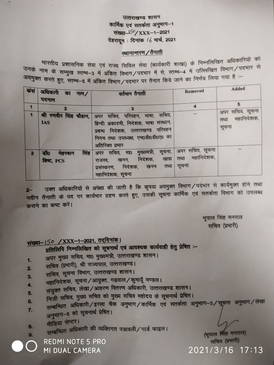 देहरादून। शासन द्वारा रणवीर सिंह चौहान (आई.ए.एस.) अपर सचिव, परिवहन, भाषा, सचिव हिन्दी अकादमी, निदेशक भाषा संस्थान, प्रबन्ध निदेशक उत्तराखण्ड परिवहन निगम तथा उपाध्यक्ष एमडीडीए को अपर सचिव सूचना तथा महानिदेशक सूचना का भी दायित्व सौंपा गया है।