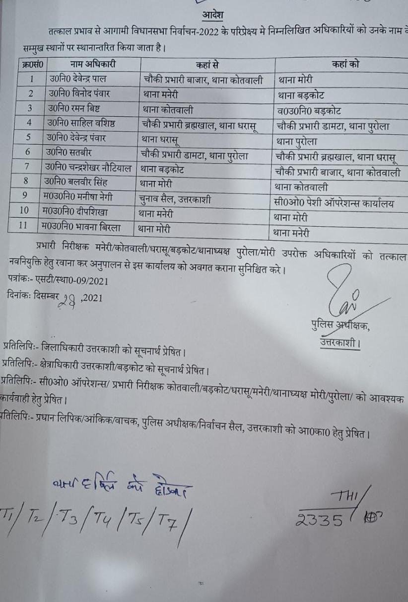 उत्तरकाशी के नए पुलिस कप्तान ने विधान सभा चुनाव 2022 को ध्यान मे रखते हुए 11 उप निरीक्षकों को इधर से उधर ट्रान्सफर किया है | गंगा और यमुना घाटी मे बंटे उत्तरकाशी जनपद मे नए पुलिस कप्तान पीके राय ने आते ही सबसे पहले अपनी कार्य शैली को लेकर अपने ही महकमे मे एक संदेश देने का प्रयास किया है |