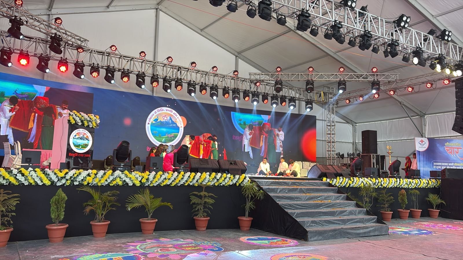 рдЙрддреНрддрд░рд╛рдЦрдВрдб рд░рд╛рдЬреНрдп рд╕реНрдерд╛рдкрдирд╛ рдХреЗ 25 рд╕реНрд╡рд░реНрдгрд┐рдо рд╡рд░реНрд╖реЛрдВ рдХрд╛ рдЙрддреНрд╕рд╡ тАФ рджреЗрд╡рднреВрдорд┐ рд░рдЬрдд рдЙрддреНрд╕рд╡ тАФ рджреВрд╕рд░реЗ рджрд┐рди рдЙрддреНрддрд░рдХрд╛рд╢реА рдореЗрдВ рдкреВрд░реЗ рд╢рдмрд╛рдм рдкрд░ рджрд┐рдЦрд╛рдИ рджрд┐рдпрд╛ред рдЬреИрд╕реЗ рд╣реА рдХрд╛рд░реНрдпрдХреНрд░рдо рдХреА рд╢реБрд░реБрдЖрдд рд╣реБрдИ, рдкреВрд░рд╛ рдкрд░рд┐рд╕рд░ рд▓реЛрдХ-рд╕рдВрд╕реНрдХреГрддрд┐, рд░рдВрдЧреЛрдВ, рддрд╛рд▓ рдФрд░ рдЙрддреНрд╕рд╛рд╣ рд╕реЗ рдЧреВрдВрдЬ рдЙрдард╛ред